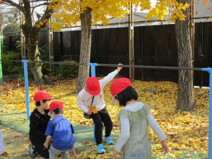 学校のイチョウの木から、黄色いきれいな葉が落ちてきました。子どもたちはその葉を集めて楽しそうに遊んでいました。