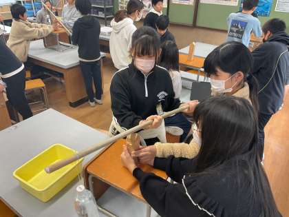 「持つところが支えているところに近いと〜。」と体験した手応えを