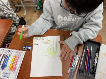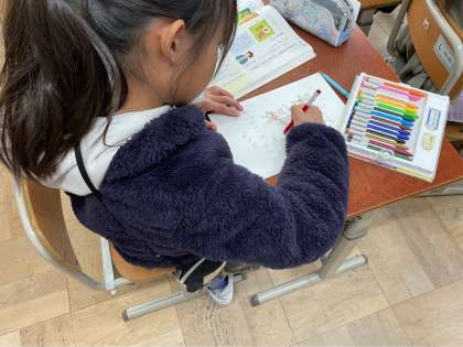 国語では、2学期最後の学習である『お話のさくしゃになろう』をしています。お話を、はじめ・なか・おわりの3つに分けて考え、ストーリーを考えていきました。1組は一足先にお話が完成しました。今日は、表紙と裏表紙をつくりました。いろいろな工夫を考え、とてもすてきなお話に仕上がりました。個人懇談会で保護者のみなさまにも見ていただけたらと思っていますので、楽しみにしていてください!!