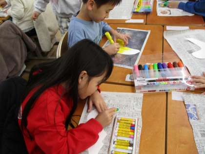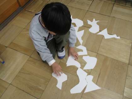 いろいろな形の紙を用意して、その紙をじっと見つめながら何が思いつくか考えました。「オットセイに見える。」「テルテル坊主にしようかな。」と楽しみながらペンやパスで描きました。一人一人が作品を発表し、笑顔あふれる時間となりました。