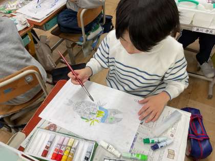 白黒の紙版画を作成しました。1枚はそのまま、2枚目は絵の具を使って色を付けました。色を付けた版画も素敵な作品になりました。