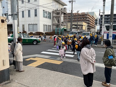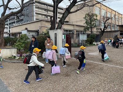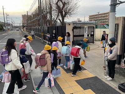両方の校門の前で、PTAの皆様にあいさつで子どもたちを