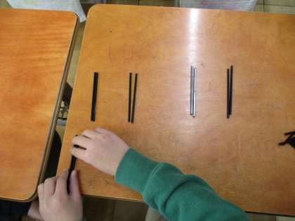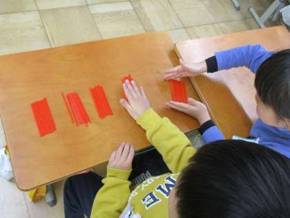 20よりも大きな数の学習が始まりました。今日は、棒の数を数えて、いくつになるのかを考えました。2本ずつ並べたり、5本ずつ並べたりしていましたが、10のまとまりを作ると数えやすいことに気が付いていました。