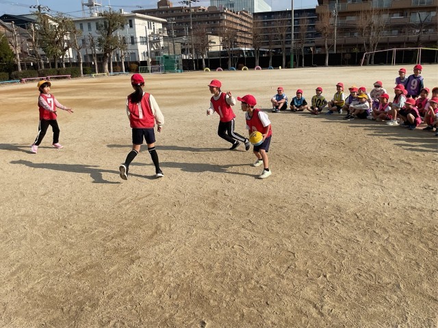 今日からの体育は、パスゲームの学習に入りました。ぽかぽかとあたたかい陽気の中、「あつい!!」と言いだすくらいにたくさん動いた子どもたちです。ひとつ前の学習で、なげあそびをしていたので、その学習も生かしてたくさん投げたりキャッチをしたりしていました。