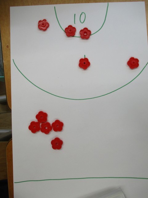 算数の時間におはじきゲームをしました。おはじきを10個はじいて、10点の場所に何個入ったか、1点の場所に何個入ったか、合計がいくつになったかを考えて友達と数を比べます。勝ったり負けたりして楽しく学習できました。