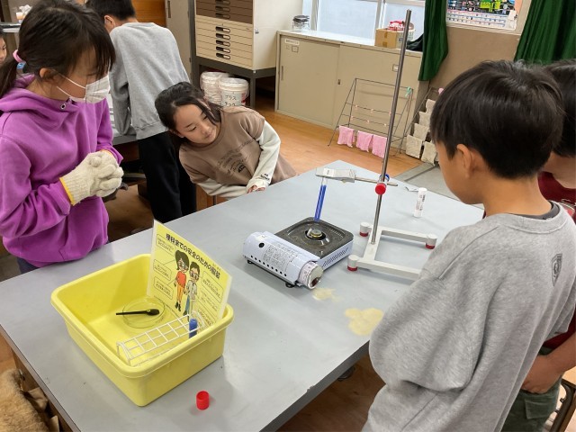 示温液を使って、水のあたたまり方を調べました。下から温めたり上から温めたりすることで水がどのようにあたたまるのかを知ることができました。
