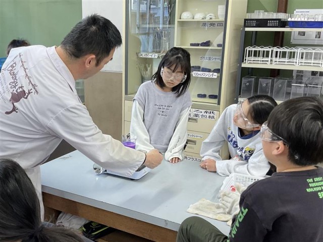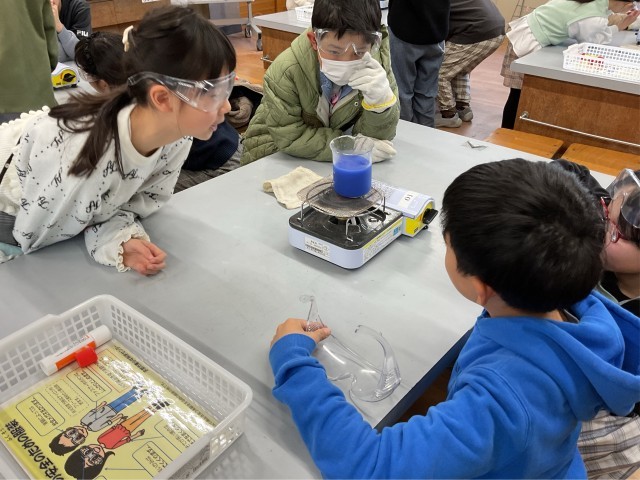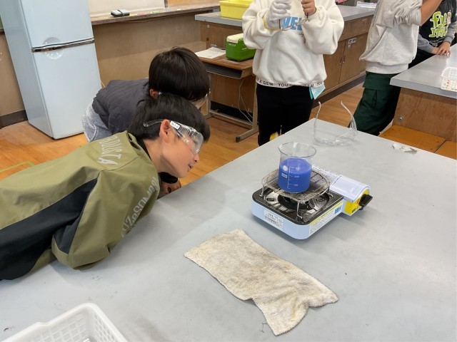 示温液を混ぜた水をあたため、どのように全体があたたまるのかを実験しました。示温液の色が変わっていく様子をグループで確かめることができました。
