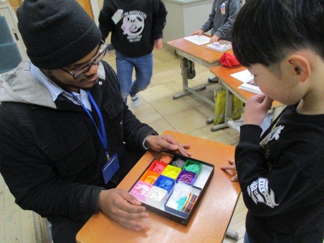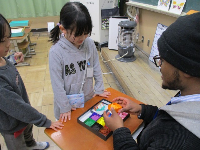 子どもたちは、自分のチョウを作るために、好きな色で羽を塗りました。そして、ALTに英語で話しかけて、羽の模様にする色画用紙を受け取りました。次の時間には、全員が英語でやりとりをします。楽しみながら英語でのやりとりが身に付くといいなと思っています。