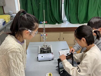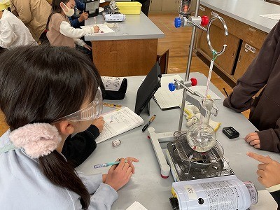 「あわがたくさんでてきた。」「湯気も出てきたよ。」「あれ、100℃付近であまり温度が変わらなくなった。」と、熱し続けているときの様子をじっくり観察していました。