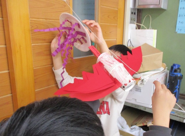 先週に紙コップや紙皿とクリップを使って、滑る仕組みを作りました。今週は、模様や飾りをつけて仕上げました。ウサギやドラゴンなど、思い思いのものを作り、タコ糸に引っ掛けて滑らせてみました。自然とお互いの作品を交流する姿が微笑ましかったです。