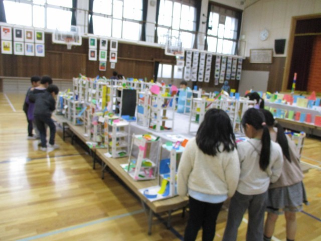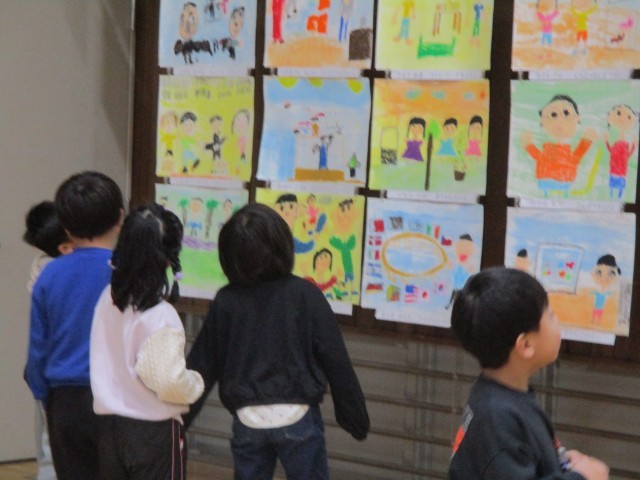体育館で始まった作品展に行きました。立体作品を見て「本物みたい!」と驚いたり、「あの魚がかっこいいね!」とお気に入りを見つけたりして、鑑賞を楽しんでいました。来年はどんな作品を展示することになるのか楽しみです。
