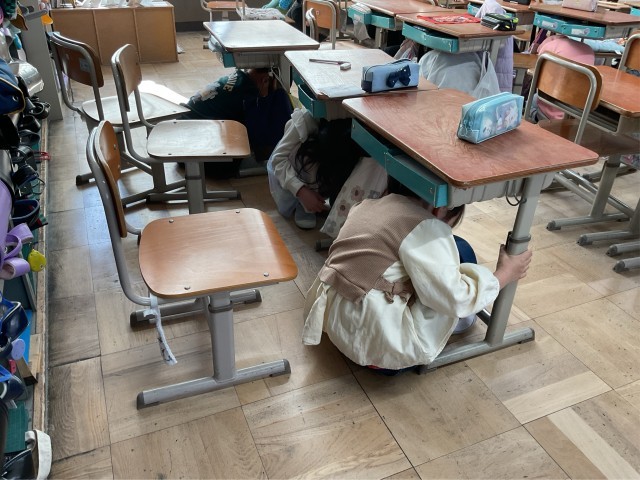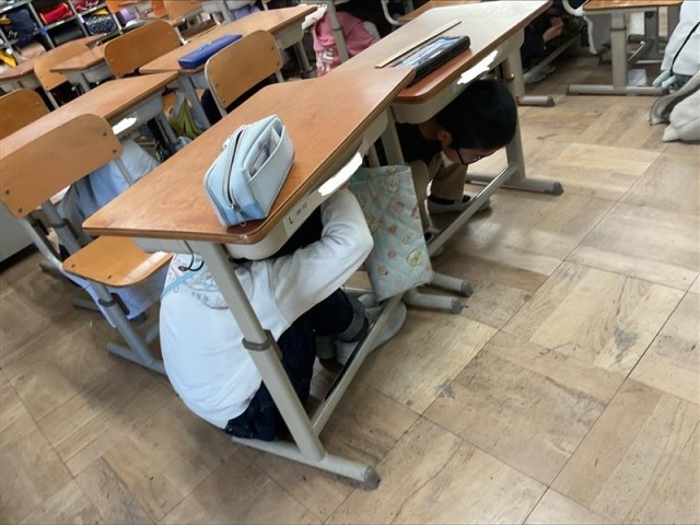 教室では、安全指導をして、地震が起きた時の行動について確認をしました。子どもたちはすぐに行動を起こすことができ、素晴らしかったです。訓練後の教頭先生のお話で、「まだ行方不明者がいる。」という話を聞き、「家族に会いたいから、ずっとさがしてるんじゃ・・・」と思いを寄せ、涙を流す子もいました。