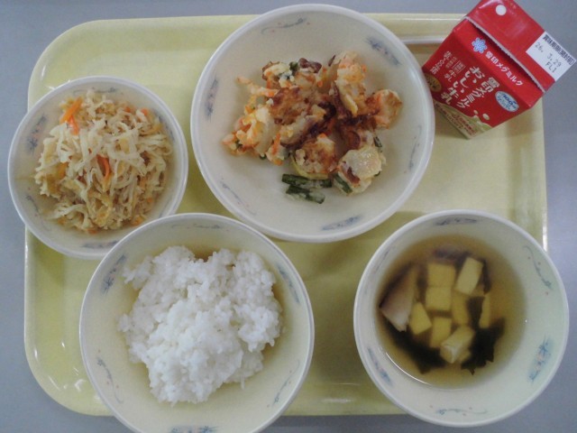 本日は新献立の「米粉のかきあげ」が登場しました。小麦粉を使用したかきあげはこれまでも提供されていましたが、米粉を使用したものについては、初の試みです。