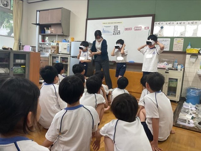 4月の保健指導は、視野についてのお話を聞きました。1年生の視野を知る眼鏡をつけて周りを見てみると、首を大きく動かさなければ見えないことがわかりました。4年生になると、視野が広くなることを知り、「そうなのか。」と驚いた様子の子どもたちでした。
