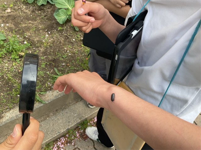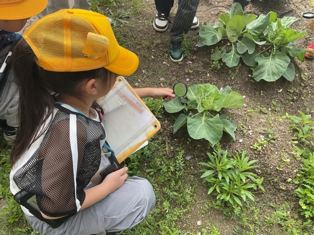理科では、春の生きものの観察をしました。生きものが苦手な子もいますが、しっかりと生きものを見つけていました。キャベツの裏にイモムシがいたり、花にひっそりとクモがいたり、「なんの生きものかわからない。」という謎の生きものがいたり。