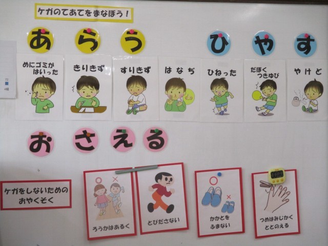 身体計測の時間に、怪我をしたときにどうすればよいのか考えて、正しい方法を学びました。集中して話を聞いている姿に成長を感じました。