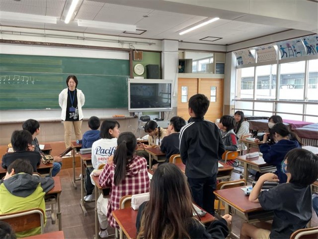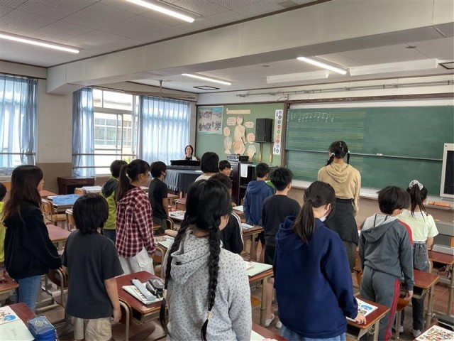 音楽の学習が始まりました。ド・レ・ミ・ファ・ソ・ファ・ミ・レ・ドの音階に沿ってお・は・よ・う・ご・ざ・い・ま・すと声だしをしていました。元気な声をひびかせて、楽しみながら音楽を学んでいます。