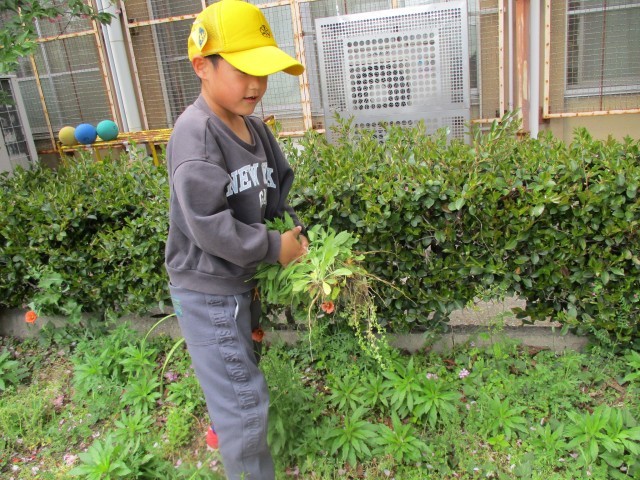 2年生の畑の草が伸びていたので、みんなで抜きました。そこに、夏に収穫できる野菜を育てようと思います。チューリップを育てた植木鉢では、ミニトマトを育てる予定です。