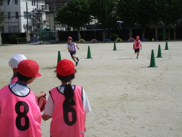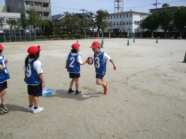 リレーあそびの学習がはじまりました。1年生の時に学習した「くねくねリレー」をしました。2チーム対抗でリレーをするので、スタートの合図やゴールの仕方などを学びました。これからの学習が楽しみです。