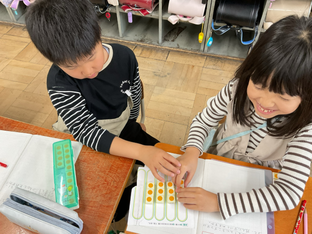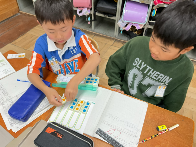 今日は数図ブロックを使いながら、わり算の考え方を学びました。友だちと楽しみながら学習しています。
