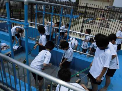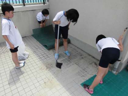 写真は,腰洗い槽とサンダル置き場の掃除をしているところです。