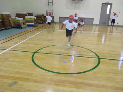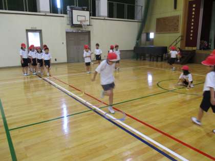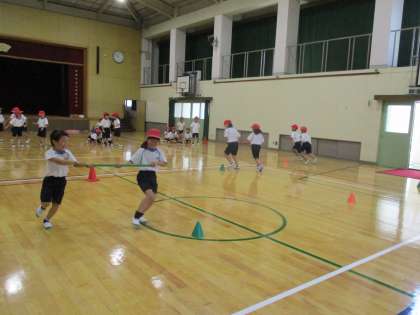 ようぐあそびでは,棒やプラフープを使って楽しく体を動かしています。みんな夢中になって活動していました。
