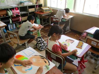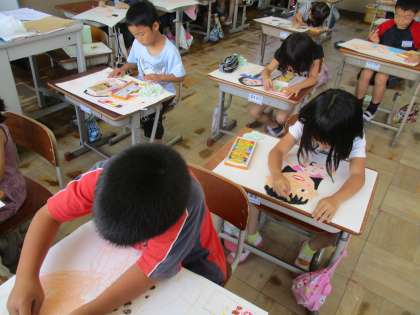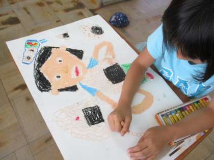 全校遠足に行った時のお弁当を食べている写真を見ながら,おにぎりを食べているわたしを描いています。お米一粒一粒を頑張って描いています。