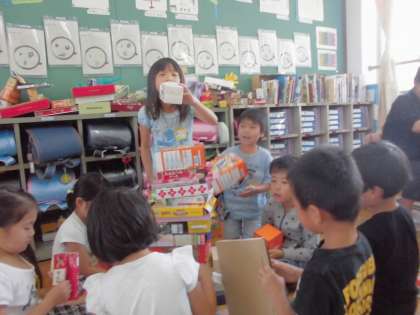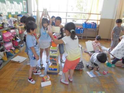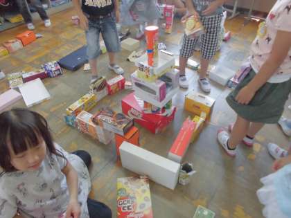 いろいろなはこをつかって,積んだり並べたりしました。箱を積んで,タワーやビルをつくったり,ならべて道を作ったり,最後には,みんなで合体して一つの町になりました。