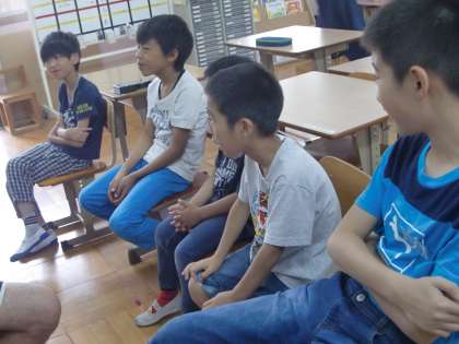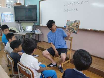 朝のベースステディの時間に、6年生の吉田宗樹先生が読み聞かせに来てくれました。