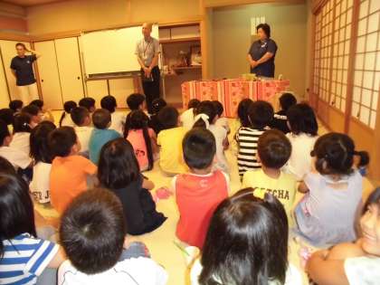 歯科衛生士の谷内さんによる,虫歯になる仕組みや歯磨きの仕方など楽しいお話にみんなくぎづけでした。お人形のはやりちゃんの登場もあり,みんなワイワイ,身を乗り出してお話を聞いていました。