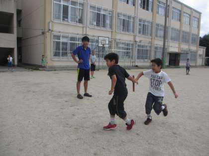 体育の学習で学んだ,バトントスを思い出しながら走りました。