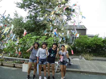 笹飾りが風でひらひらと揺れ,夏のすてきなひとときを過ごしています。