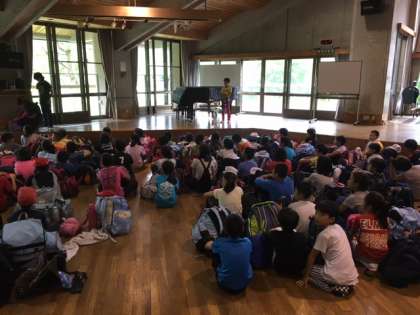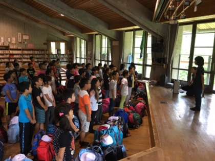 5年生は,花背山の家に到着しました。雨は,降っていないのでよかったです。入所式を行いました。この後,施設めぐりを行います。