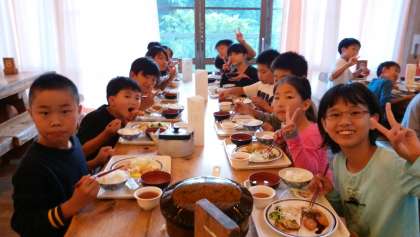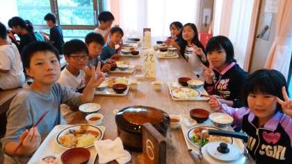 バイキング形式なので,たくさん食べていますか?この後のナイトハイクに備えてくださいね。