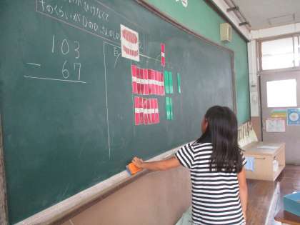 たしざんとひきざんのひっさん(2)もそろそろ終わりに近づいてきています。くり上がり,くり下がりを考えるときに,数え棒を使ったり,ノートに数え棒の図をかいたりして考えています。