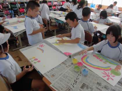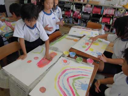 液体ねんどに絵の具をまぜて,感触を楽しみながら,指や手のひらで絵を描きました。大胆に描くことができ,とても楽しそうでした。