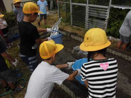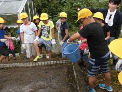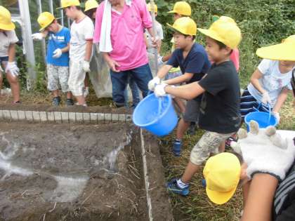 ふわふわになった土に石灰を混ぜ,水をあげました。