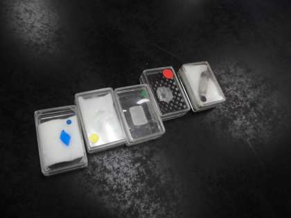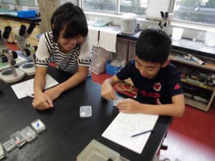 結晶の観察をしました。写真は,食塩,砂糖,硫酸銅,水晶,ミョウバンの結晶です。