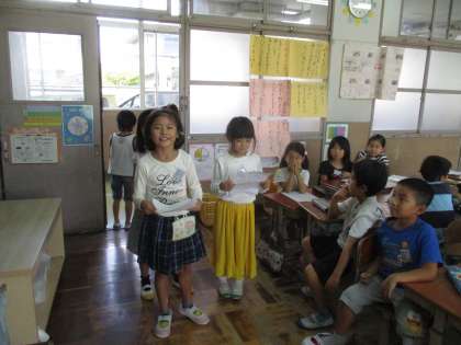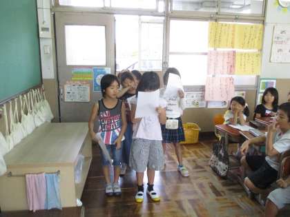 インタビューの前日に,インタビューの練習をしました。お店の人にしっかり質問ができるように,はっきりした声で,お店の人の顔をみて,礼儀正しくなど,ポイントを子どもたちと話し合って練習をしました。