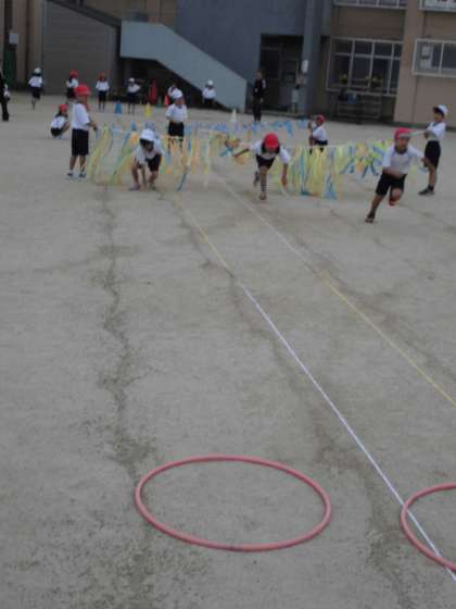 運動会の練習の様子です。ゴムを跳びこえたり,くぐったり,フープをくぐりぬけたりします。