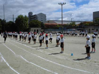 2重円になったり,各クラス2列になったり,移動が多いですが,がんばっています。