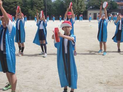 衣装を着て,初めて入場から退場までを運動場で通しました。