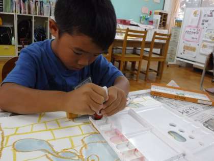 気をつけながら色塗りをして,