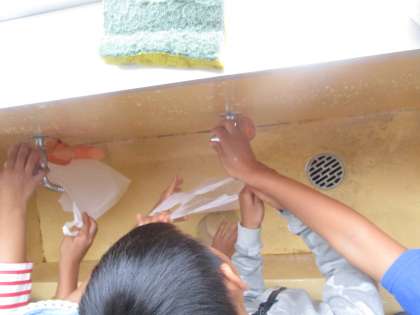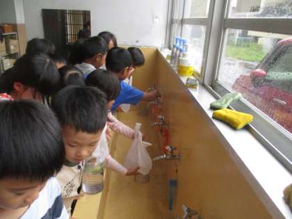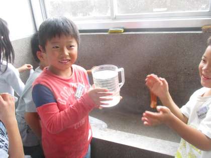 色々なものに水を入れて,1Lのかさを予想する学習をしました。「ぴったりだ!」「少し足りなかった」など楽しんで量感をつかむ学習をしていました。