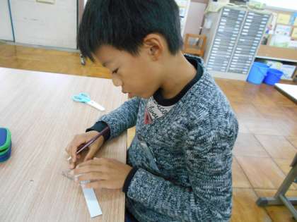 厚紙に1mm,1cmの長さを測って切り取り,教室の中でそれぞれの長さのものが無いかを探しました。