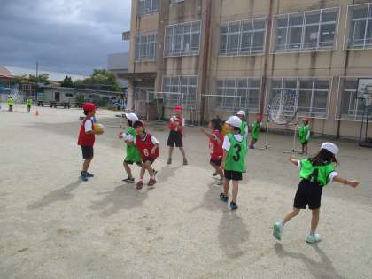 体育で「パスゲーム」が始まりました。雨でなかなかできず,今日が2回目でしたが,みんなやる気満々で活発に活動していました。「○○さんにパスをして!」「あっちの方へボールをパスしよう!」と,頭も使って声を掛け合いながら進めていました。