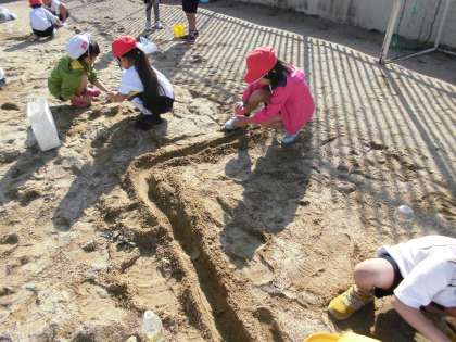砂場でおやまをつくったり,だんごをつくったり,川を作ったりしました。