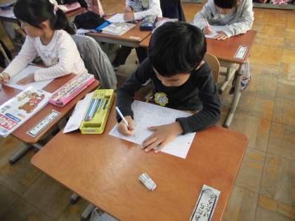 視力検査がありました。視力検査を待っている間にひらがなの復習をしました。集中して,線からはみ出ないように丁寧に書いていました。