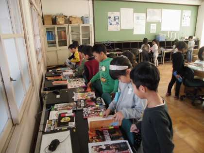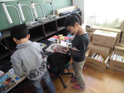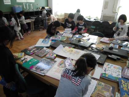 図書室に置いてほしい本をそれぞれ1冊選びました。たくさんの本から読みたい本を選んでいました。