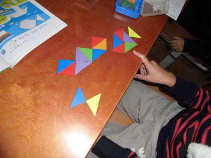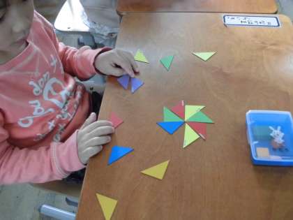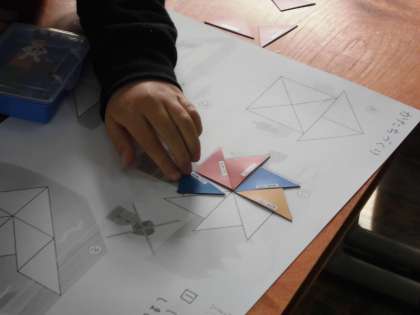 いろいたならべをしました。絵と同じように並べてみました。そのあと,自分で考えて三角のいろいたを使っていろいろなかたちをつくってみました。